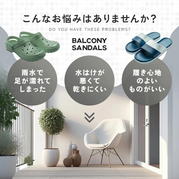 「軽くてソフトなベランダサンダル A02」は、穴あきソールで水が抜けやすく、雨上がりでも快適に使えるサンダルです。