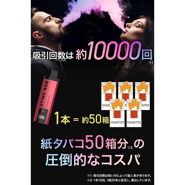 最大吸引回数10,000回。「10,000」パフ1本で紙たばこ50箱分に相当する圧倒的なコスパを実現。