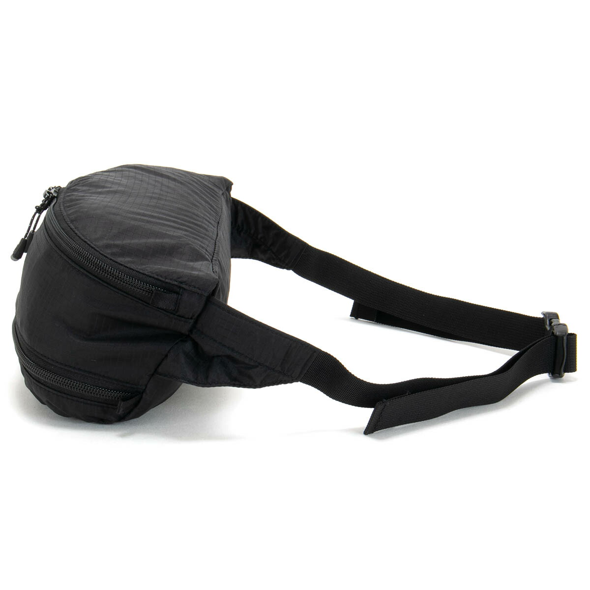 仕様:ファスナー開閉 バナナの皮をむくようにジッパーを開けると、中からウエストポーチが現れます。さらに下部のジッパーを開閉することで容量を二段階に変更できます。