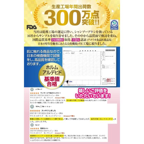 【 提携工場 】当社は提携工場の選定に伴い、頭皮ブラシを扱っている16社からサンプルを取り寄せました。その中から品質面で検討を重ね、国際品質基準ISO9001取得、FDA認証(アメリカ食品医薬品局/日本の厚生労働省にあたる公的機関)の1工場に絞りました。
