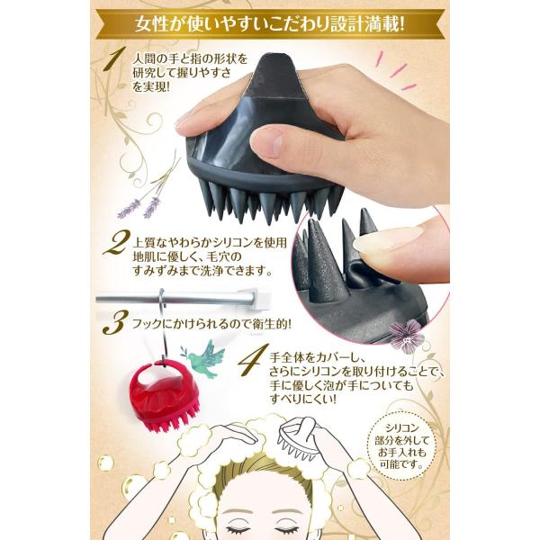 【こだわりのシャンプーブラシ】高品質なシリコン使用 | フックにかけられるので衛生的 | 最高のフィット感を実現 | 滑り落ち防止カバーを装着 | 豊富なカラー展開 | お客様の状況に合わせて4種類のトゲ形状を提供 | トゲの数にもこだわり、より効果的に使用可能