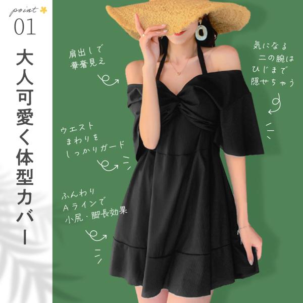 肩が出るデザインで華奢見えに加え、ウエスト周りをしっかりガードする事で