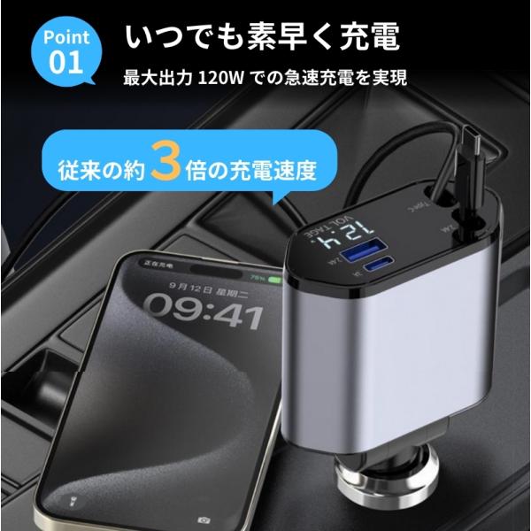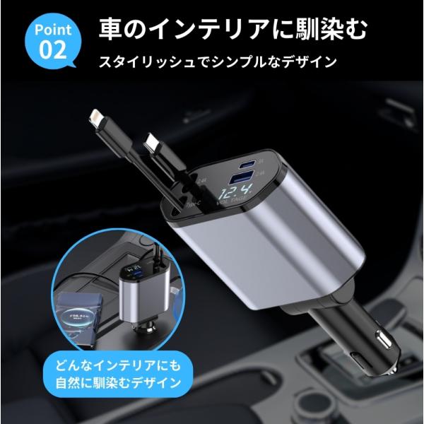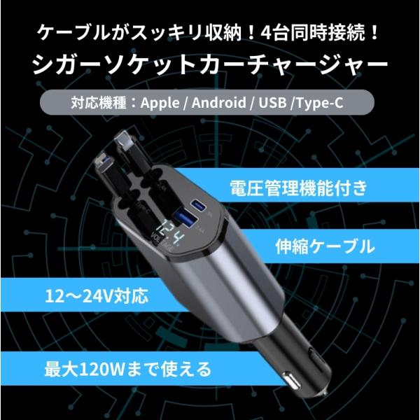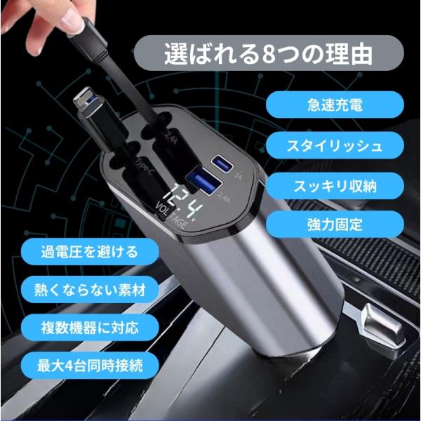 シガーソケット usb カーチャージャー 急速 充電器 車用 iphone typec lightning スマホ 巻き取り リール式 伸縮ケーブルシガーソケット カーチャージャー爆買