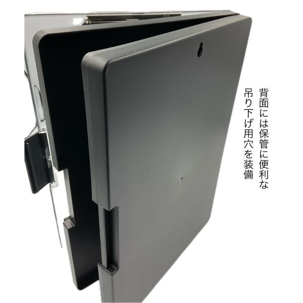 表(外側)に挟み用クリップ、下段ボックスにペンホルダー、裏面に吊り下げ用の穴を装備