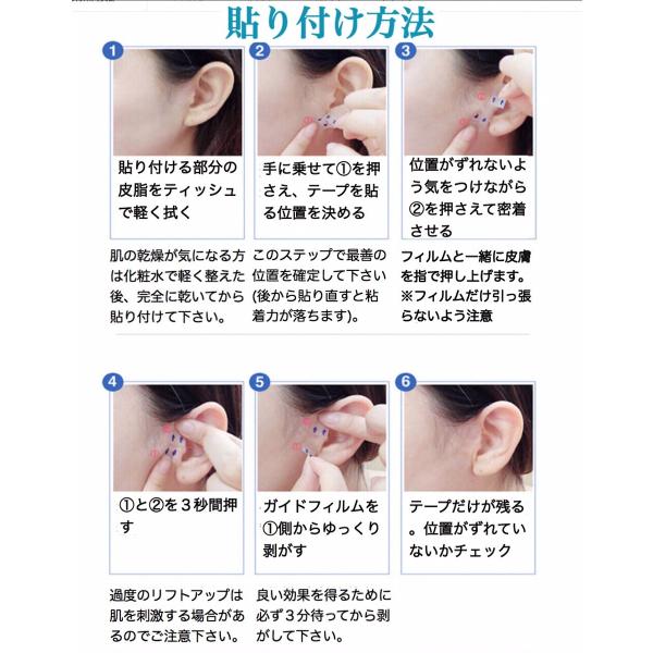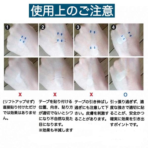 〇テープを張り付ける位置、向き、貼り方が適切でないとシワになり不自然な見た目になります(効果も半減します)。また引っ張りすぎにもご注意下さい。
