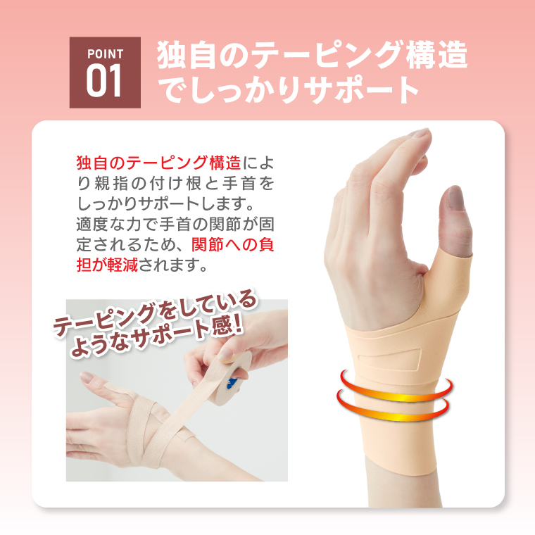 伸縮性の良い生地を使用しているので肌にフィットし、自然と指が開く独自のテーピング構造により親指の付け根と手首をしっかりサポートします。