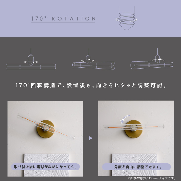 口金上のパーツ部分が約170度回転するので、照明器具に取り付けたあとでも電球の向きを微調整可能。壁付け・縦付け・斜め付けなど多様な設置スタイルに対応できます。