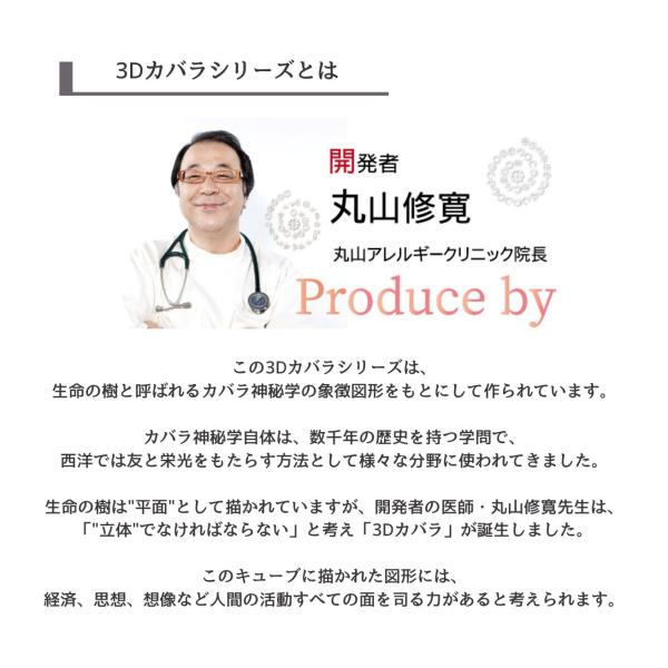 3Dカバラ・パドマの図形は、生命の樹を「三角錐」の形に立体化したものがモチーフになっています。これは、丸山医師が長年の研究の中から創り出されたオリジナルの図形で、心の世界など、スピリチュアルな部分を刺激し、高次元の世界やスピリチュアル・ガイドとの交信を可能にします。