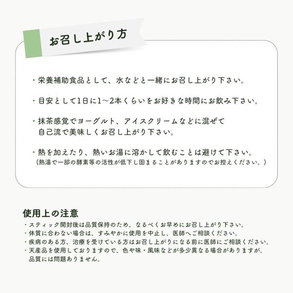 また、牛乳や豆乳、ヨーグルトなどで溶いていただいても、くせのない抹茶風味でおいしくお召し上がりいただけます。