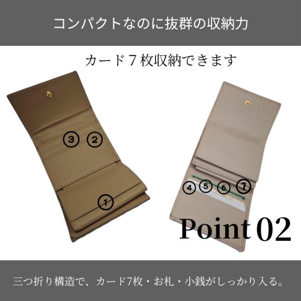 → 三つ折り構造で、カード7枚・お札・小銭がしっかり入る。小さいバッグにもすっぽり。