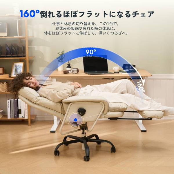 ・160°まで倒れるフラットチェア:最大160°の大角度リクライニングで、オフィスでも深い休息が可能。4段階角度ロックで作業・読書・休憩・仮眠に最適な姿勢をキープ。ロッキングで揺られながら、心身の緊張もリセットできます。