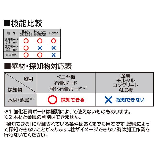 矢印型ライトとブザー音で壁裏の見えない間柱をお知らせします。壁材がベニヤや石膏ボードの時に木材と金属を探知可能(木材と金属の判別はできません)。本体サイズ:136×54×35mm