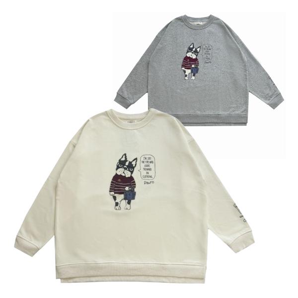 バックスタイルも かわいい ゆったり 大きめ シルエット ミニ裏毛トレーナー パウロ柄 刺繍 レディース 犬柄 ブルドッグ キャラクター クスグル Kusuguru A倉庫