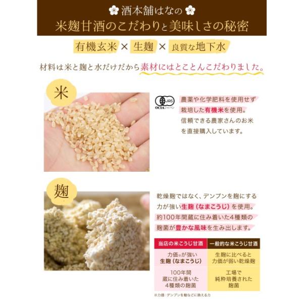 国産の有機玄米を使用。麹の糖化作用のみで糖度40度以上に仕上げました。お湯や水で薄めて飲む濃縮タイプの甘酒。ジャムの代わりにトーストやヨーグルトにもお使いいただけます。