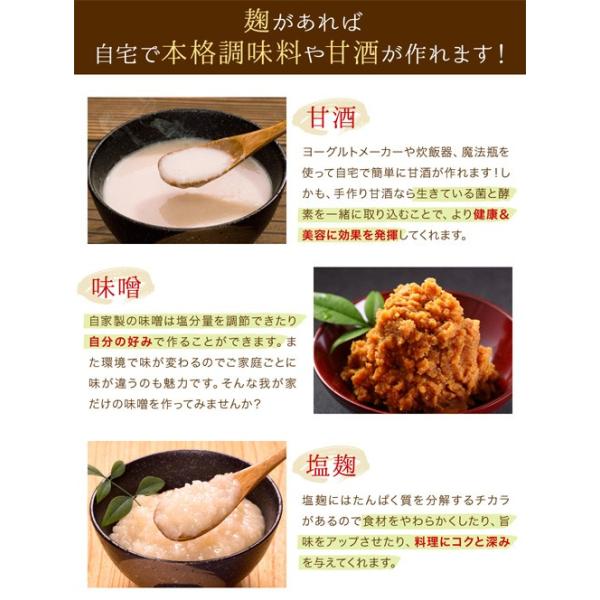 商品説明:味噌つくりには欠かせない、米こうじを乾燥させ使いやすくしました。甘酒、塩こうじつくりにご使用ください。