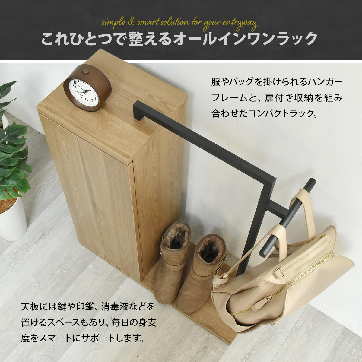 玄関や子ども部屋をすっきり整える、収納付きハンガーラック。扉付き収納には高さ調節できる棚が2枚付き、小物や充電器などの整理に便利。背面には配線穴もあり、コードを隠してスマートに使えます。バッグや帽子を掛けられるT字バー付きで、毎日の身支度がもっとスムーズに。