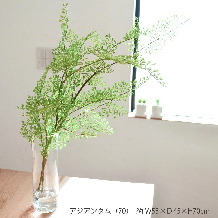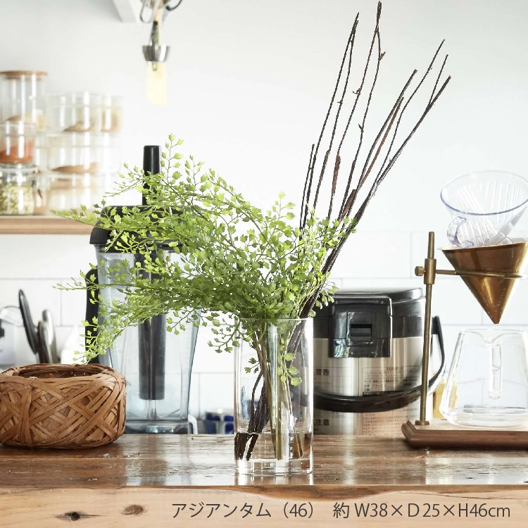 小さな緑色の葉っぱが生い茂る姿が愛らしく人気のアジアンタムを、クリアな円筒状のシンプルなガラス花瓶に生けていただきます。