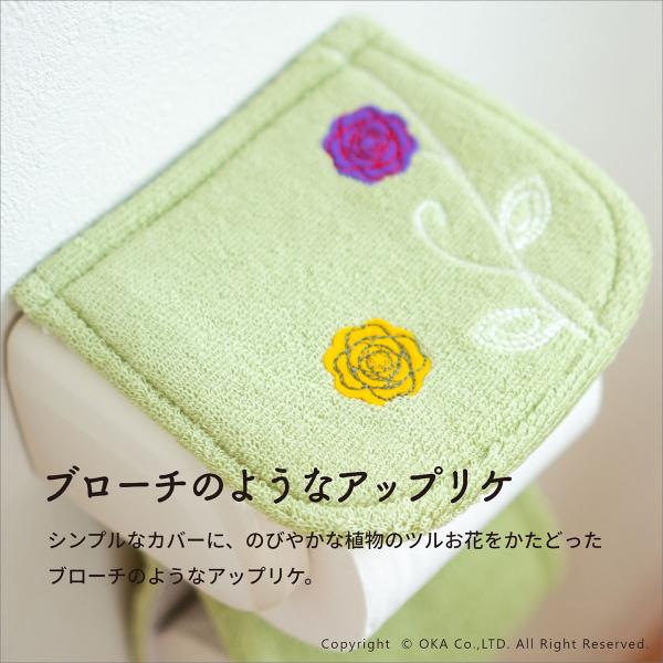 シンプルなカバーにデザインされたフラワーモチーフのアップリケがアクセントの北欧風トイレットペーパーホルダーカバーです。ホルダー下部にトイレットペーパーのスペアを1ロールストックできます。タオル地素材でやさしい雰囲気、簡単にお洗濯していただけます。あたたかく、心地よく、自宅で過ごす時間がほんの少し、素敵になりそうなゆったりとした雰囲気のデザインです。カラーは毎日にそっと彩りを添える、ピンクとベージュ、グリーン、イエローの4色です。