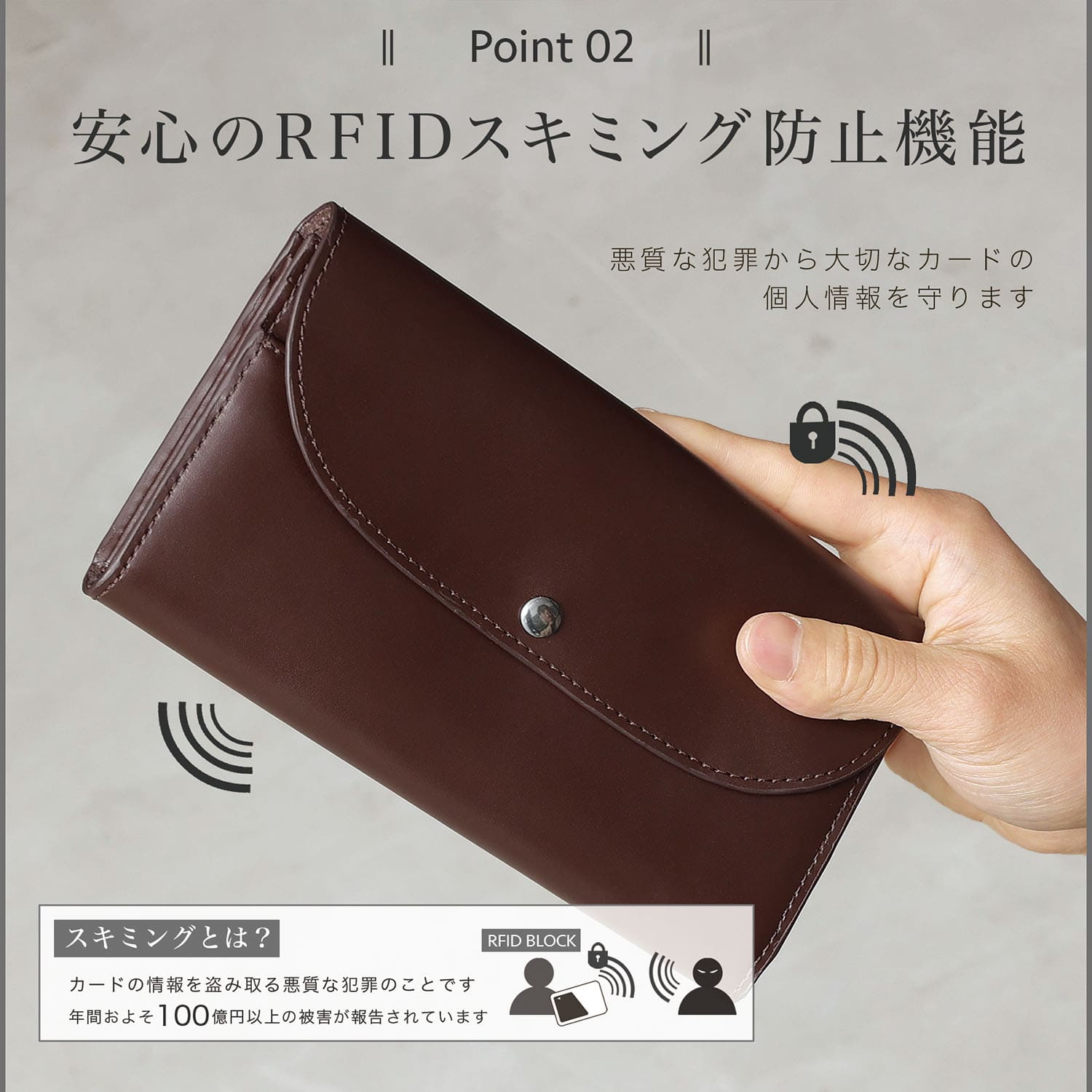 キャッシュレス化が進んで便利な世の中になった反面、スキミングという犯罪も横行しています。スキミングとは、特殊な機械を使用し、知らない間にカードの情報を抜き取るという非常に悪質な犯罪です。そんな悪質なスキミングの犯罪からあなたの大切なカード情報を守るべく、財布全体にスキミング防止機能を搭載しました。海外旅行に行く方に特におすすめな仕様となっています。