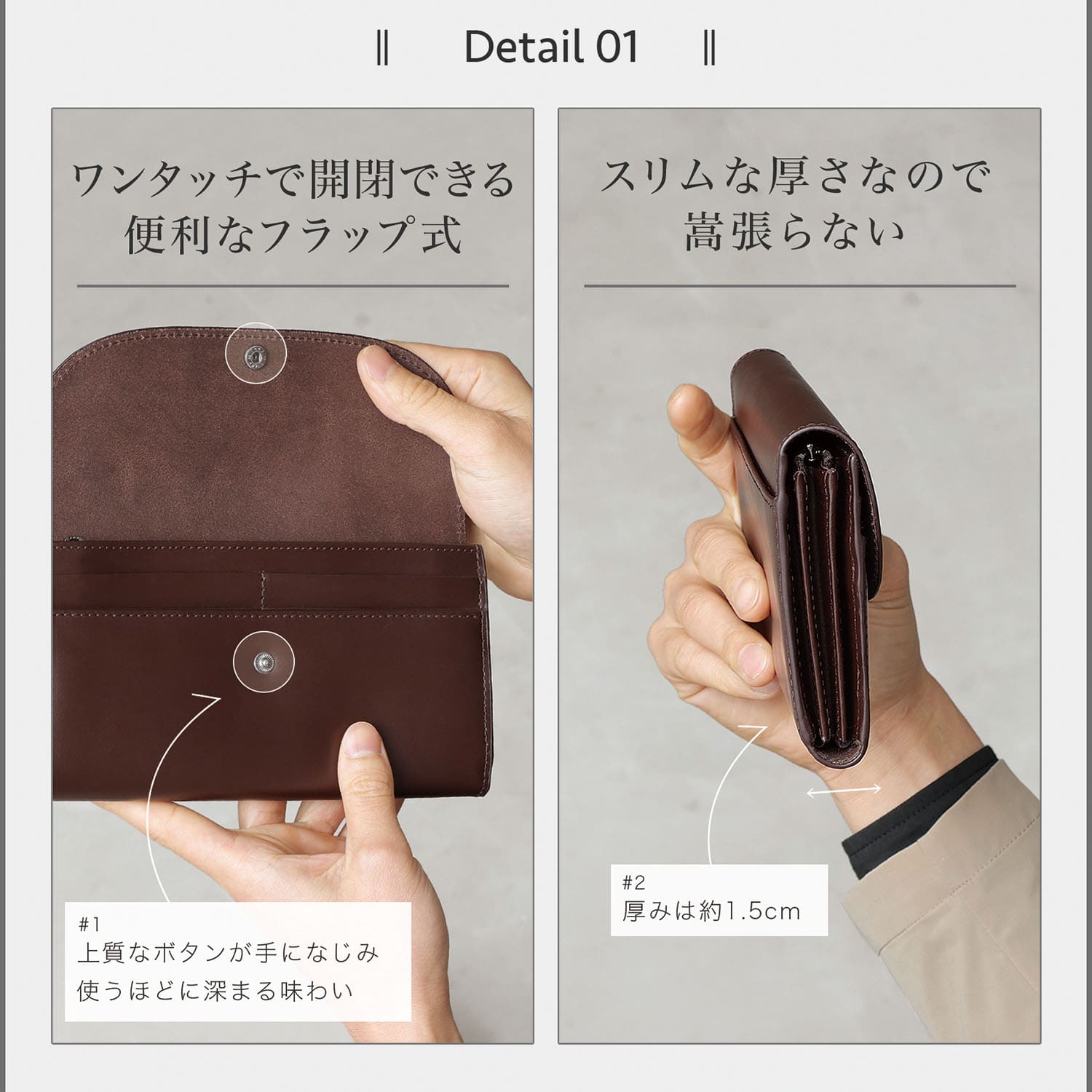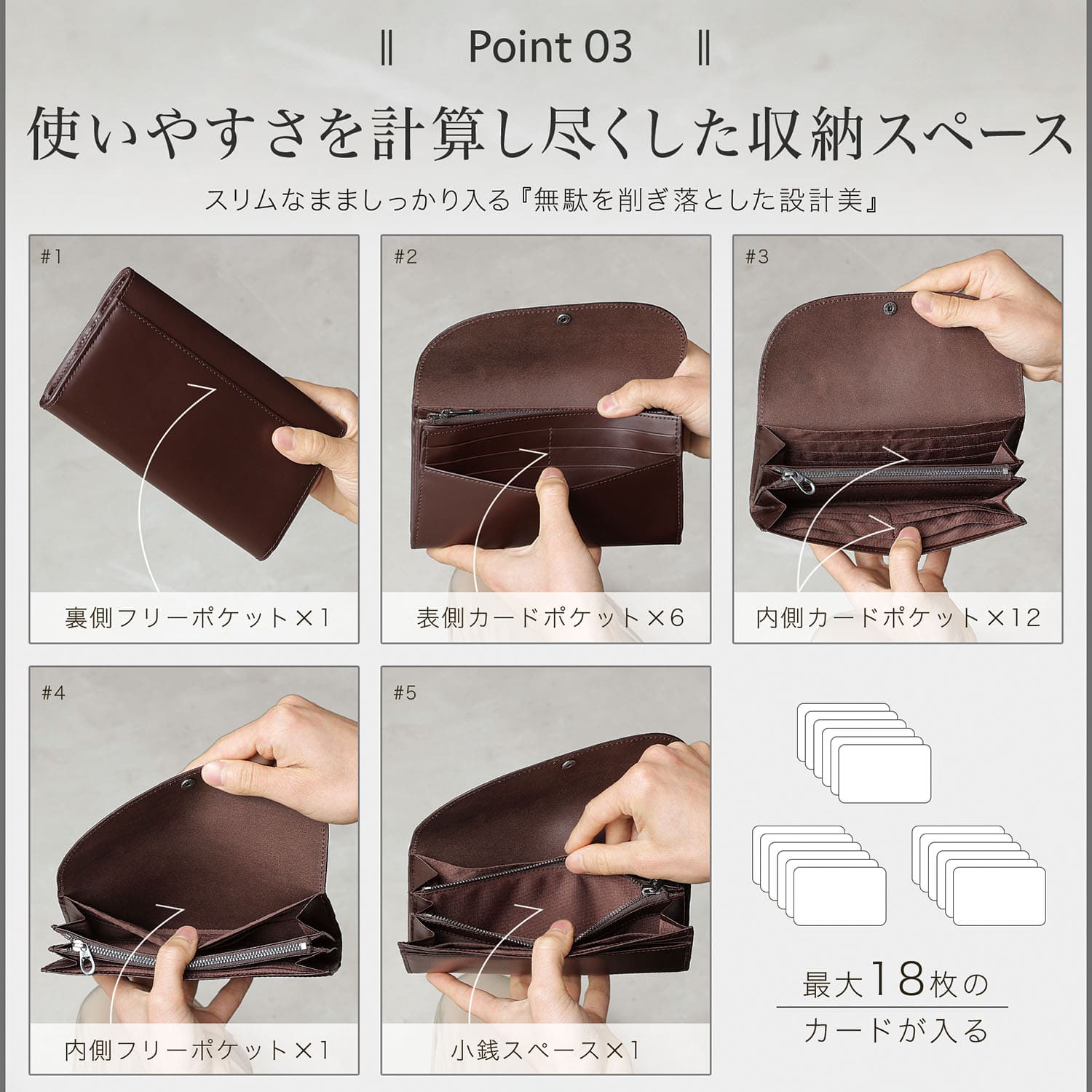 指先でスマートに開く上質なボタン仕様。18枚ものカードを美しく収める圧巻の収納力。無駄を削ぎ落とした洗練デザインは、使うたびに心地よい高揚感を与えてくれます。艶やかな黒と深みのある青が織りなす気品が、ビジネスにもカジュアルにも優雅に馴染みます!