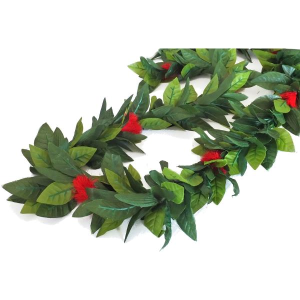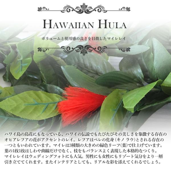 ハワイ島の島花にもなっている、ハワイの伝説でもたびたびその美しさを象徴する存在のオヒアレフアの花がアクセントのレイ。レフアはペレの化身 (キノ ラウ)とされる存在の 一つともいわれています。マイレは3種類の大きめの緑色リーフ(葉)で仕上げています。 葉の1枚1枚はしわや曲線だけでなく、枝をもバランスよく表現した本格的なつくり。 マイレレイはウェディングフォトにも人気。男性にも女性にもリゾート気分をより一層引き立ててくれます。またインテリアとしても、リアルな彩を添えてくれるでしょう。