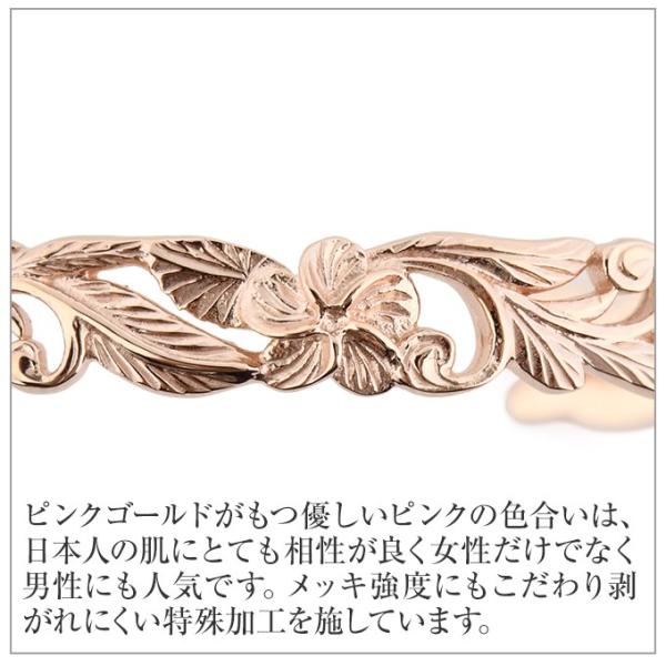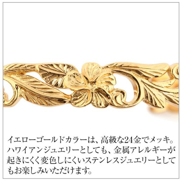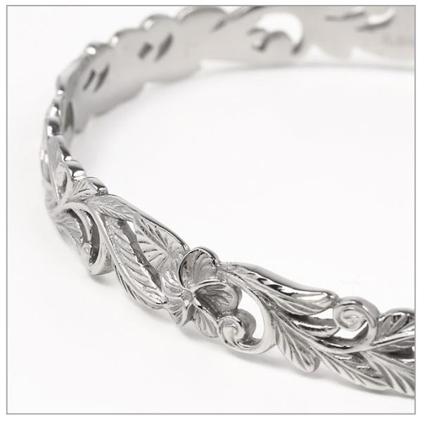 【詳細】ハワイアンジュエリーのバングルとしては定番のプルメリアがポイントで入っている、スクロール(波)柄のデザインです。またマイレもデザインに取り入れています。特徴としては、エッジをカットアウト(柄に沿ってカットする技術)していて、ストレートエッジより、優しいイメージになるところです。また、柄のみでデザインを完結させていますので、通常の透かしデザインとは、まったく違う独特の雰囲気です。プルメリアは愛のお花。スクロール(波)は繰り返し幸せが来るようにと願いがこめられ、マイレは魔除けや厄除けの意味があり、ハワイでは重要な儀式などにも使われる神聖なものです。男女ともに使える、ユニセックスデザインで、大きさも、閉じたり開いたりすることで、ある程度調整できますので、男女ともに使用できます。 present