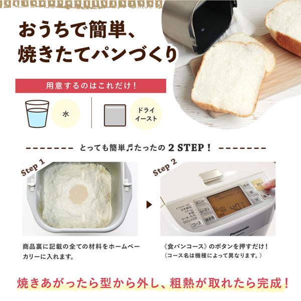 ドライイーストとのセットなので、水とバターをご用意いただくだけで、ホームベーカリーの食パンを手軽に自宅でお焼きいただけます。
