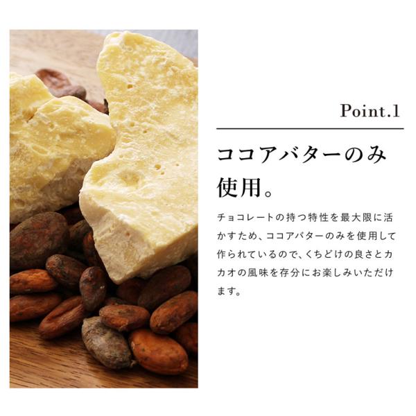 チョコレートの持つ特性を最大限に活かすため、ココアバターのみを使用して作られているので、口溶けの良さとカカオの風味を存分にお楽しみいただけます。