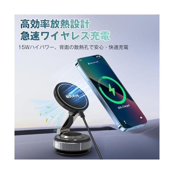 2025新登場・15W急速充電 スマホホルダー 車 ワイヤレス充電 マグネット【ナノジェル吸盤・360°回転】MagSafe 車載ホルダー 超