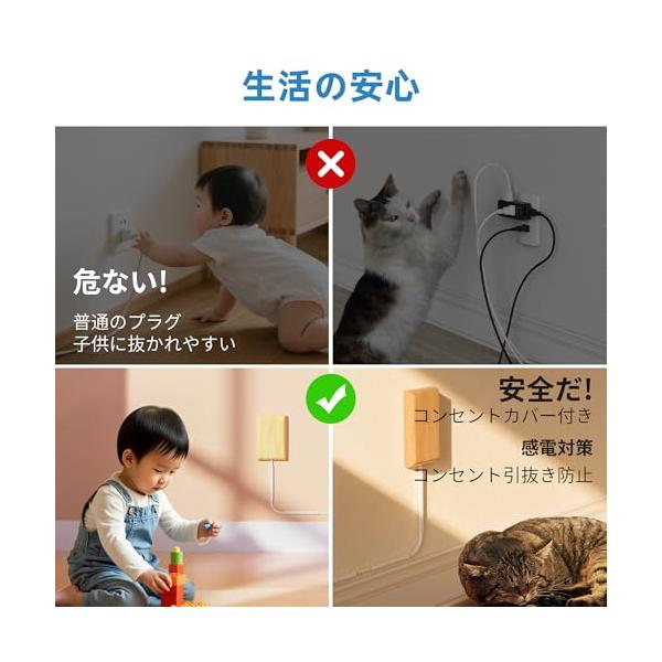 ・コンセント カバー 木目調:コンセントプラグはカバーが付いています。プラグピンを含まないカバーサイズは約148mm×95mm×20mmです。※ご注意:カバーの深さは約20mmですから、壁コンセントと本製品のサイズが異なる場合は、本製品を挿入する際にカバーと壁コンセントの間に少し隙間があります。購入前にサイズを確認してください。