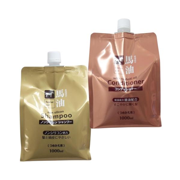熊野油脂 馬油 ノンシリコン シャンプー&コンディショナー 詰め替え 1000ml 選べる2個セット 弱酸性 保湿 ダメージケア 頭皮ケア 日本製 ツバキ油 不飽和脂肪酸