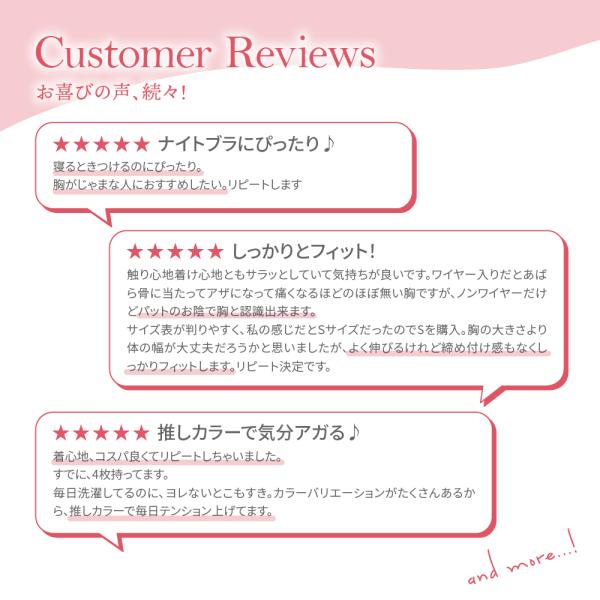 伸縮性に優れ、圧迫感がなく、さまざまな体形にフィットする大人気ノンワイヤーブラ!バストをしっかり包み込んで、寝ている時のストレスを軽減してくれる快適なつけ心地!脇や背中の気になる段差もしっかり包み込み脇から支えて横流れを防止してくれるから横になっても安心!胸の低い部分からバストにぴったりとフィットする高低差をつけた特殊な厚みのパッドを採用。カラーバリエーション豊富に13色を取りそろえました♪
