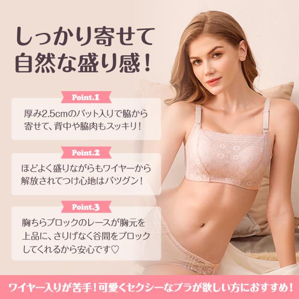しっかり寄せつつ背・脇肉をスッキリさせ自然な盛り感!厚み2.5cmのパット入りで脇から寄せてほどよく盛りながらもワイヤーから解放されてつけ心地はバツグン。胸ちらブロックのレースが胸元を上品な印象にしてくれ、さりげなく谷間をブロックしてくれます。ワイヤー入りが苦手!かわいくセクシーなブラが欲しい方におすすめ!