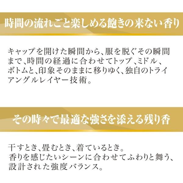 ●時間の流れごと楽しめる飽きの来ない香り。キャップを開けた瞬間から、服を脱ぐその瞬間まで、時間の経過に合わせて、ミドル、ボトムと、印象そのままに移りゆく、独自のトライアングルレイヤー技術。