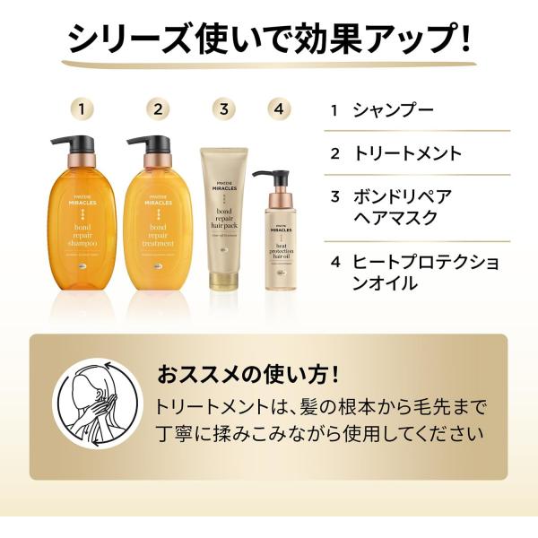 パンテーンのプレミアムライン「ミラクルズ」より登場したボンドリペア モイスチャー&パワーリペアは、髪内部のダメージに着目し、内側からしっかり補修することを目指した集中ケアシリーズです。