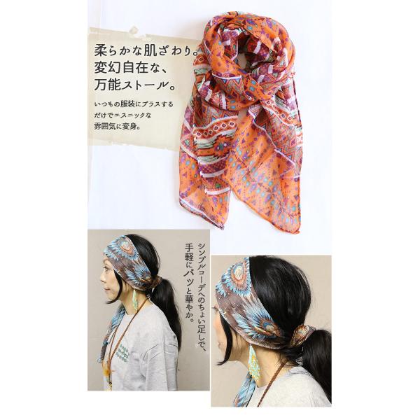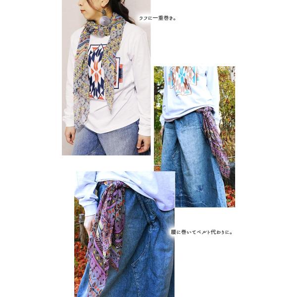 コメント: アイデア次第でいろいろ使えるエスニック柄ストール。いつもの服装にプラスするだけでエスニックな雰囲気に変身。パッと華やかに顔周りを彩ります。 軽い素材で、裏地は無く、透け感のある軽やかな肌ざわり。ミラノ巻きで小顔効果も。挿し色にぴったりなカラーで、コーディネートの幅を広げてくれます。