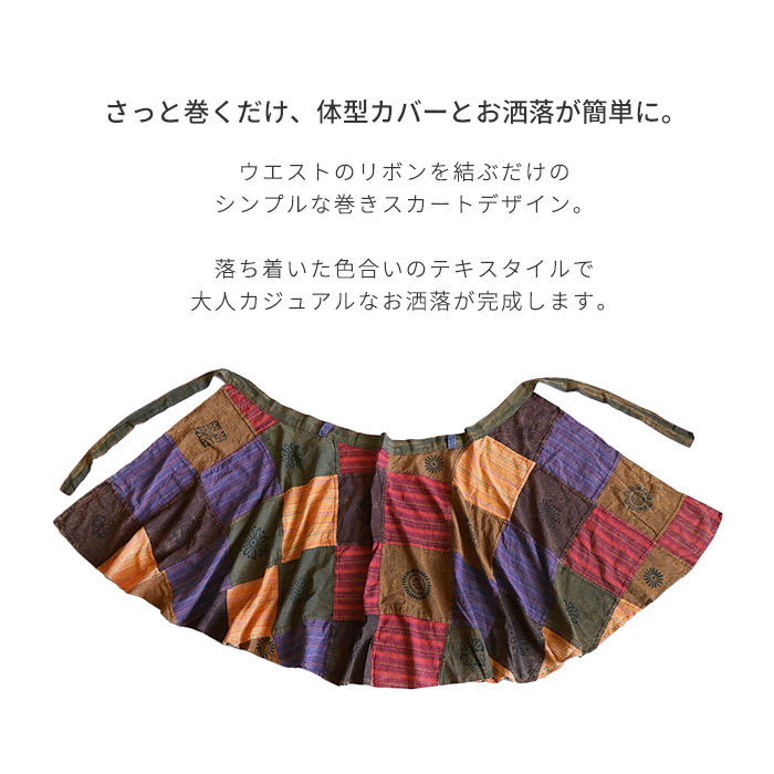 スカート 巻きスカート ラップスカート フレア ロング ミモレ ミディアム 膝下 エスニック パッチワーク チベット 山ガール レディース ファッション(3)