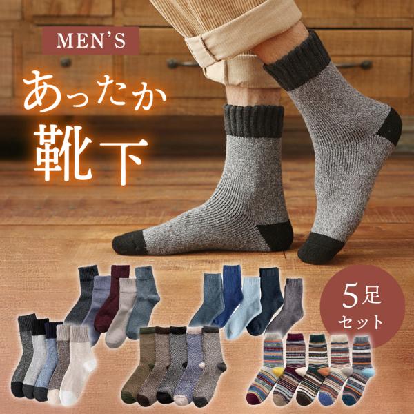 靴下 メンズ 冬 暖かい 厚手 5足セット 無地 クルー丈 ソックス 福袋 おしゃれ 男 クルーソックス カジュアルソックス 冷え対策
