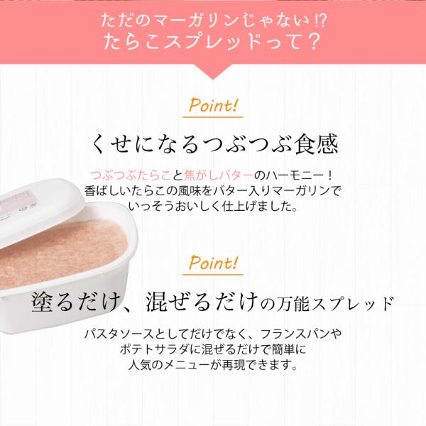 特徴:パンに塗ってトーストしたり、パスタソースに使ったりもできる便利な1品です。たらこのつぶつぶ食感がくせになります。