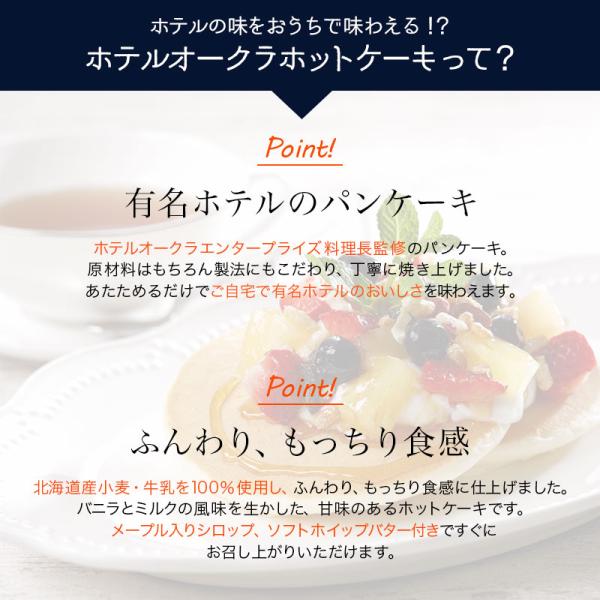 特徴:株式会社ホテルオークラエンタープライズ料理長が監修した本格ホットケーキ。北海道産小麦・牛乳を100%使用し、ふんわり仕上げました。
