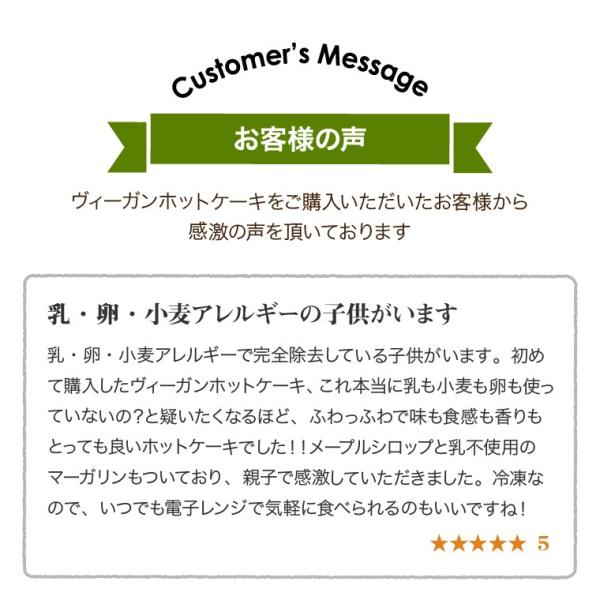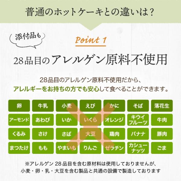 特徴:米粉を使用したホットケーキは食物アレルギー特定原材料等28品目不使用で、卵、乳製品、小麦ももちろん使用していません。メープル入りシロップとマーガリンも食物アレルギー特定原材料等28品目不使用です。