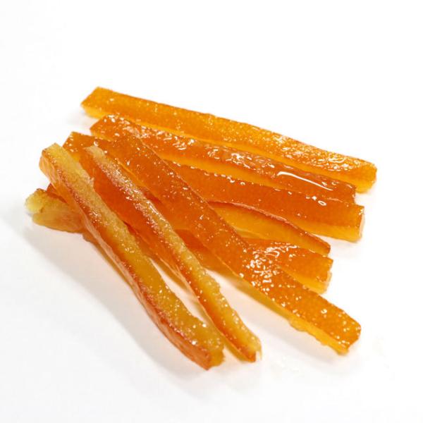 ステッィク状にカットしたオレンジの皮を水煮後、じっくりとシロップ漬けしました。色が鮮やかで香り高く、柔らかな食感です。