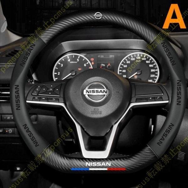 ハンドルカバー 日産 ステアリングホイールカバー カーボン調 内装品 高級 牛革 専車ロゴ 内装品パーツ 滑りにくい 文字付き Nissan 087