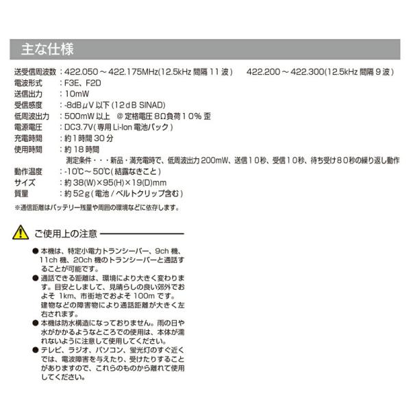 免許 資格 届出 黒 白 小型 軽量 充電 充電池 イヤホン イヤホン付き ストラップ クリップ 100m 1km 小電力トランシーバー イベント アウトドア フェス 電波 防災 被災地 連絡 <br>
