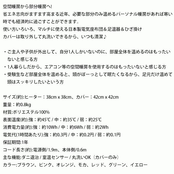 使い方いろいろ、マルチに使える日本製電気座布団&足温器&ひざ掛け カバーは取り外して丸洗いできるから、いつも清潔♪ サイズ(約):ヒーター:38cm x 38cm、カバー:42cm x 42cm 重量:約0.8kg 材質:ポリエステル100% 表面温度(約):強:約45℃ / 中:約35℃ / 弱:約25℃ 消費電力量(約):強:約10Wh / 中:約6Wh / 弱:約2Wh 電気代(1時間あたり):強:約0.3円 / 中:約0.2円 / 弱:約0.1円 保証期間:1年 コード長さ(約):電源側/1.9m、本体側/0.6m 主な機能:ダニ退治 / 室温センサー / 丸洗いOK(カバーのみ) カラー:ブラウン、ピンク、オレンジ、モカ、レッド、グリーン、イエロー ※色によって、足の入れる内側と本体の裏側の面の素材が違います。 (沖縄、離島、中継地域は別途送料かかります。) 【検索キーワード】ホットクッション ホットマット 1台3役 あんか ホット座布団 足温器 使い方 足元暖房機 おすすめ 受験生 暖房 人気 足 冷え 足入れ 暖房 ヒーター マルチヒーター 受験勉強 試験勉強 デスクワーク オフィス 事務所 テレワーク 在宅