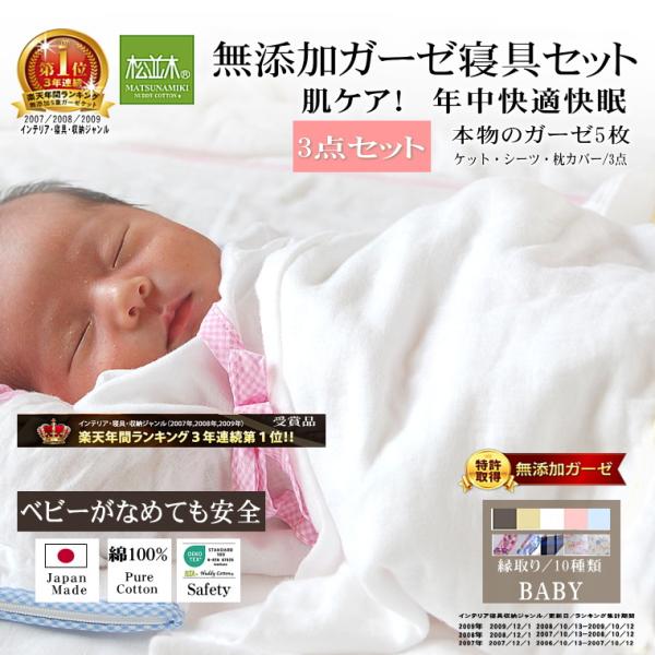 ベビー 寝具3点セット ガーゼケット シーツ 枕カバー 吸水速乾 綿100% 日本製 松並木 敏感肌 速乾 ピローケース エコテックス認証 お昼寝 出産祝い