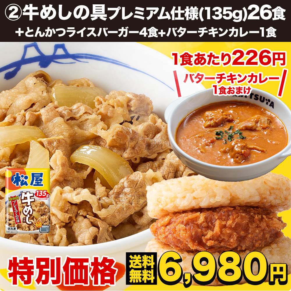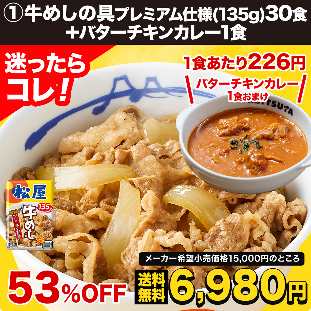 (1食226円!衝撃の53%OFF!15,000円→6,980円) 牛丼 牛丼の具 牛めしの具プレミアム仕様30食 バターチキンカレー1食おまけ 牛めし 松屋 冷凍食品 セール 半額