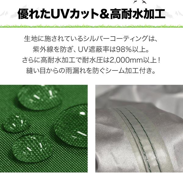 生地に施されているシルバーコーティングは、紫外線を防ぎ、UV遮蔽率は98%以上。さらに高耐水加工で耐水圧は2,000mm以上!縫い目からの雨漏れを防ぐシーム加工付き。