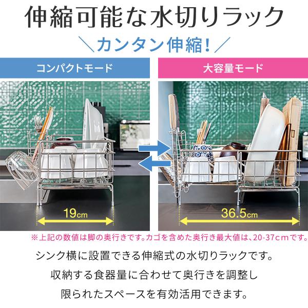 シンク横に設置できる伸縮式の水切りラックです。収納する食器量に合わせて奥行きを調整し限られたスペースを有効活用できます。