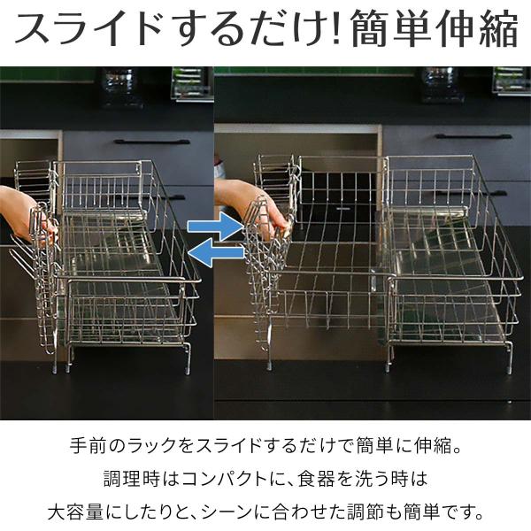手前のラックをスライドするだけで簡単に伸縮。調理時はコンパクトに、食器を洗う時は容量にしたりと、シーンに合わせた調節も簡単です。